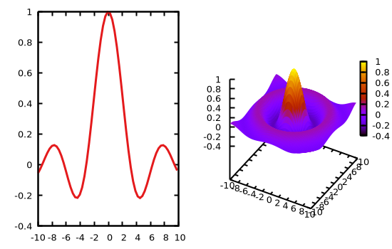 sinc2d(x,y) = sin.(sqrt.(x.^2 + y.^2))./sqrt.(x.^2+y.^2)
