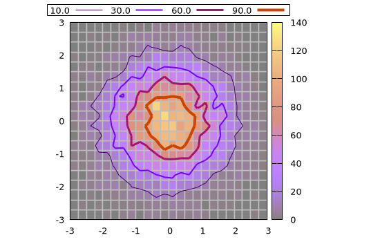 Alternatively, 2D histograms may be displayed using the boxxyerror plot style which allows more flexibility in, e.g., handling transparencies and drawing the histogram grid. In this case the data can be prepared using the boxxyerror() function, as follows: