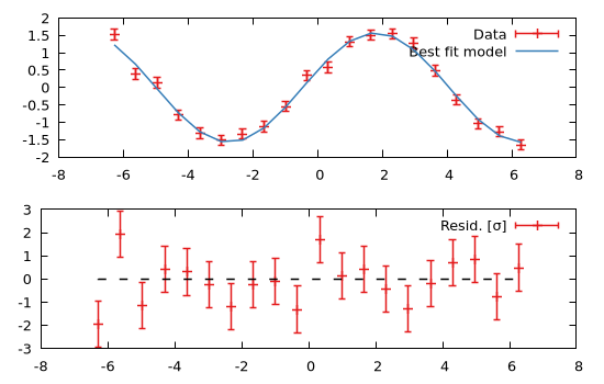 Recycling data from the previous example we can plot both data and best fit model (in plot 1) and residuals (in plot 2):