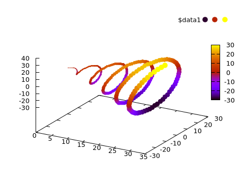 Note that the fourth array in the dataset, x./20, is used as by gnuplot as point size (ps var). Also note that all the keywords discussed above can also be used in 3D plots.