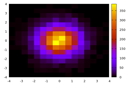 Again, a finer control can be achieved by specifying ranges, bin size or number of bins (along both dimensions) and by explicitly using the content of the returned Gnuplot.Histogram2D structure: