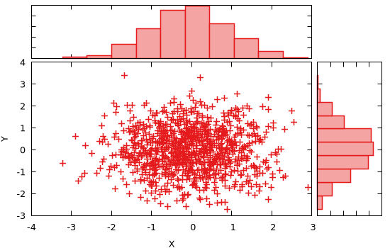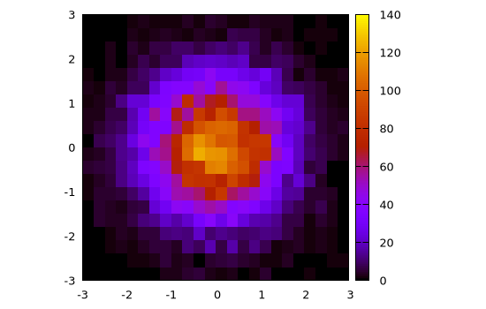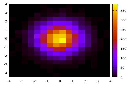 Again, a finer control can be achieved by specifying ranges, bin size or number of bins (along both dimensions) and by explicitly using the content of the returned Gnuplot.Histogram2D structure: