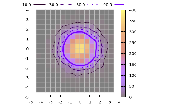 Alternatively, 2D histograms may be displayed using the boxxyerror plot style which allows more flexibility in, e.g., handling transparencies and drawing the histogram grid. In this case the data can be prepared using the boxxy() function, as follows: