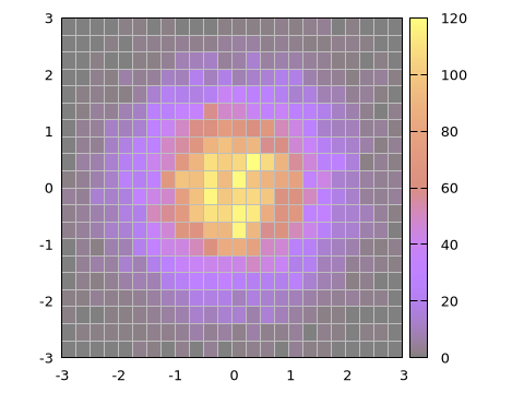 Again, a finer control can be achieved by specifying ranges, bin size or number of bins (along both dimensions) and by explicitly using the content of the returned Gnuplot.Histogram2D structure: