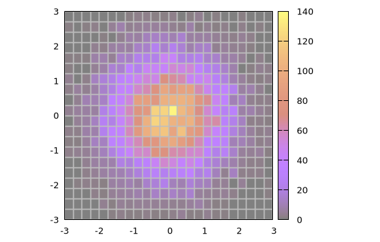 Alternatively, 2D histograms may be displayed using the boxxyerror plot style which allows more flexibility in, e.g., handling transparencies and drawing the histogram grid. In this case the data can be prepared using the boxxyerror() function, as follows: