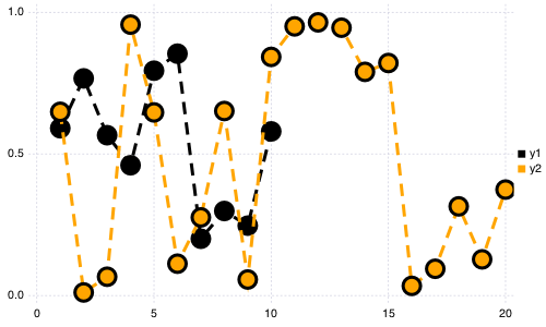 plot(Vector[rand(10),rand(20)],marker=(:ellipse,8),line=(:dot,3,[:black :orange]))