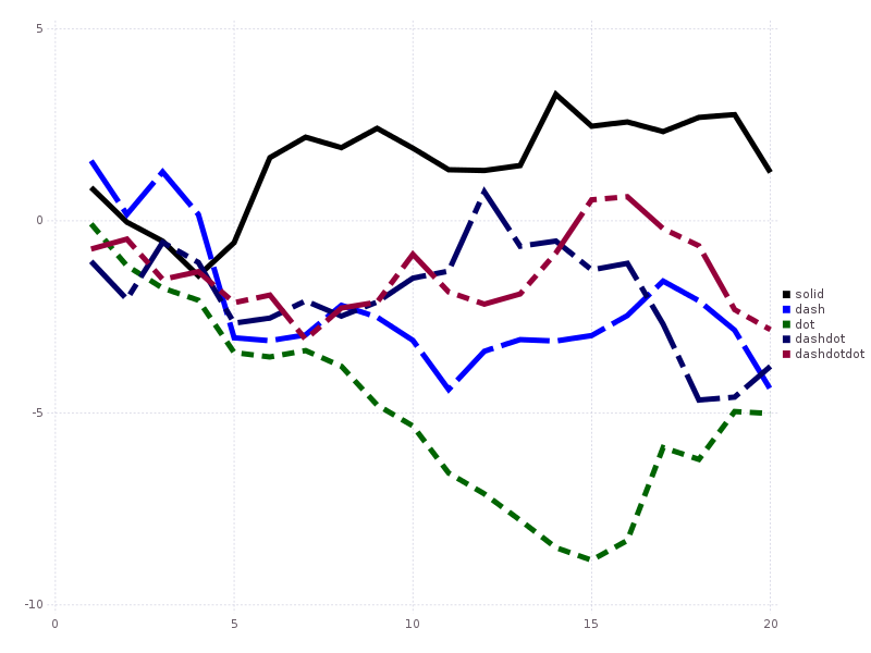plot(cumsum(randn(20,length(styles)),1); style=:auto,label=map(string,styles),w=5)