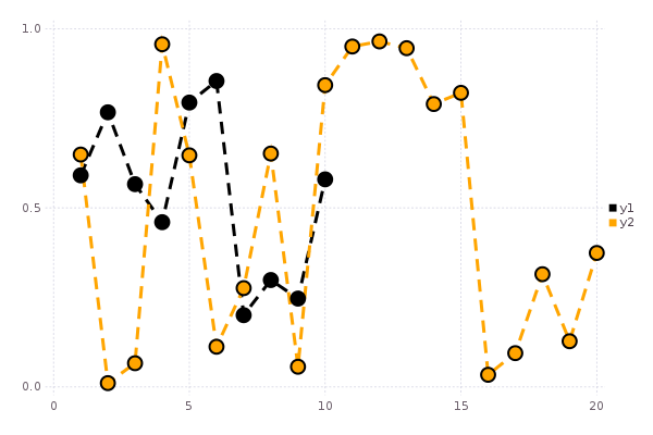 plot(Vector[rand(10),rand(20)]; marker=(:ellipse,8),line=(:dot,3,[:black :orange]))
