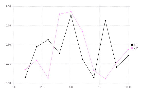 plot(rand(10,2); marker = :rect)   # this will bring up a browser window with the plot, set show=false if you don't want that