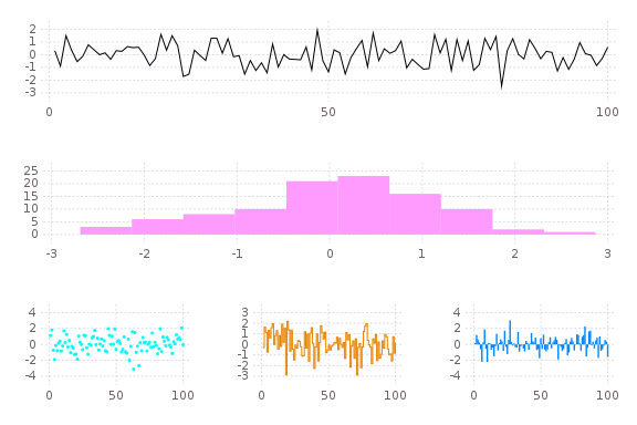 subplot(randn(100,5); layout=[1,1,3],linetypes=[:line,:hist,:dots,:step,:bar],nbins=10,legend=false)