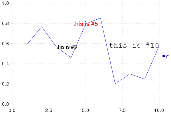 annotate!([(5,y[5],text("this is #5",16,:red,:center)),(10,y[10],text("this is #10",:right,20,"courier"))])