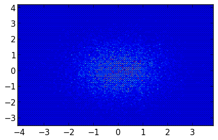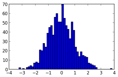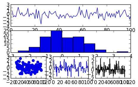 subplot(randn(100,5),layout=[1,1,3],t=[:line :hist :scatter :step :bar],nbins=10,leg=false)