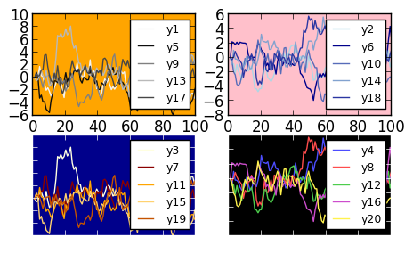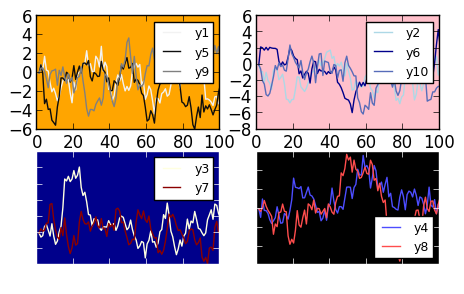 subplot(fakedata(100,10),n=4,palette=[:grays :blues :heat :lightrainbow],bg=[:orange :pink :darkblue :black])