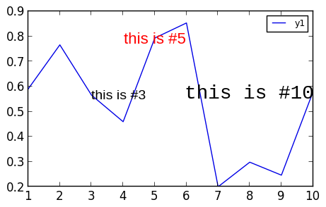 annotate!([(5,y[5],text("this is #5",16,:red,:center)),(10,y[10],text("this is #10",:right,20,"courier"))])
