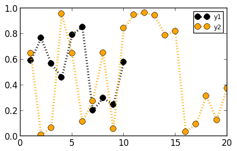 plot(Vector[rand(10),rand(20)],marker=(:ellipse,8),line=(:dot,3,[:black :orange]))