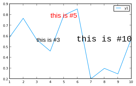 annotate!([(5,y[5],text("this is #5",16,:red,:center)),(10,y[10],text("this is #10",:right,20,"courier"))])