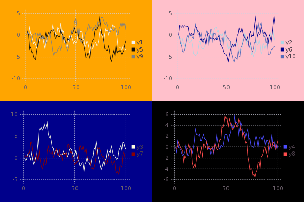 subplot(fakedata(100,10),n=4,palette=[:grays :blues :heat :lightrainbow],bg=[:orange :pink :darkblue :black])