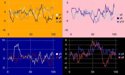 subplot(fakedata(100,10),n=4,palette=[:grays :blues :heat :lightrainbow],bg=[:orange :pink :darkblue :black])