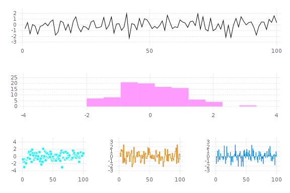 subplot(randn(100,5); layout=[1,1,3],linetypes=[:line,:hist,:scatter,:step,:bar],nbins=10,legend=false)