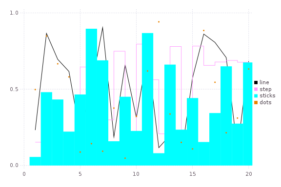 plot(rand(20,4); linetypes=[:line,:step,:sticks,:dots],labels=["line","step","sticks","dots"])