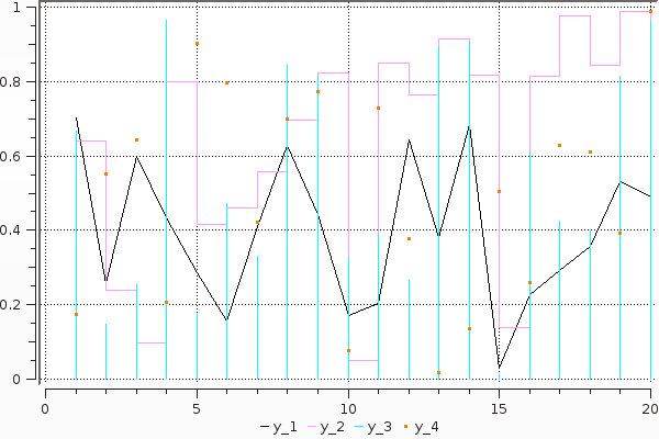 plot(rand(20,4); linetypes=[:line,:step,:sticks,:dots])