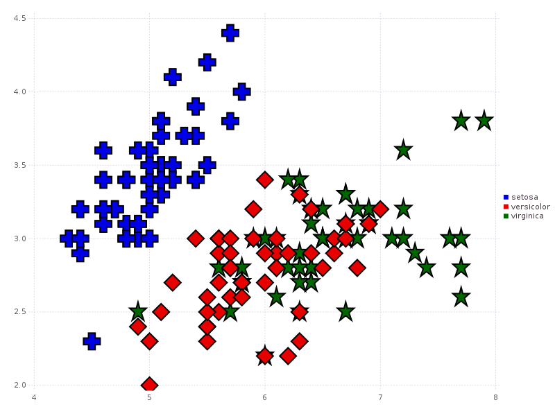 scatter(iris, :SepalLength, :SepalWidth, group=:Species, m=([:+ :d :s], 12))