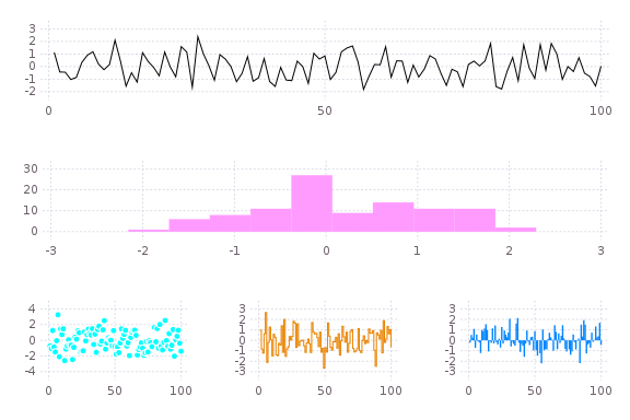 subplot(randn(100,5); layout=[1,1,3],linetypes=[:line,:hist,:scatter,:step,:bar],nbins=10,legend=false)