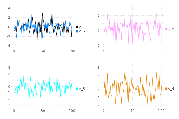 subplot(randn(100,5); layout=[1,1,3],linetypes=[:line,:hist,:scatter,:step,:bar],nbins=10,legend=false)