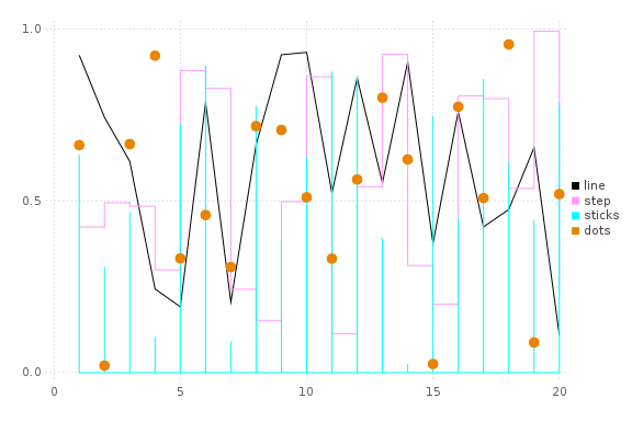 plot(rand(20,4); linetypes=[:line,:step,:sticks,:dots],labels=["line","step","sticks","dots"])