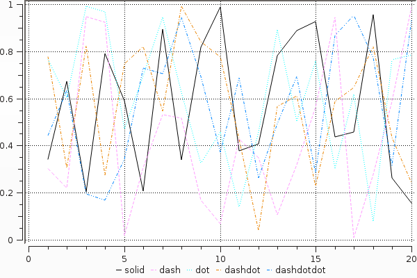 plot(rand(20,5); linestyles=[:solid,:dash,:dot,:dashdot,:dashdotdot],labels=["solid","dash","dot","dashdot","dashdotdot"])