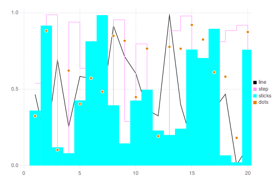 plot(rand(20,4); linetypes=[:line,:step,:sticks,:dots],labels=["line","step","sticks","dots"])