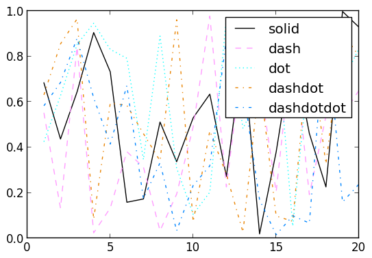 plot(rand(20,5); linestyles=[:solid,:dash,:dot,:dashdot,:dashdotdot],labels=["solid","dash","dot","dashdot","dashdotdot"])