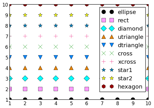 plot(repmat(collect(1:10)',10,1); markers=[:ellipse,:rect,:diamond,:utriangle,:dtriangle,:cross,:xcross,:star1,:star2,:hexagon],labels=["ellipse","rect","diamond","utriangle","dtriangle","cross","xcross","star1","star2","hexagon"],linetype=:none,markersize=10)