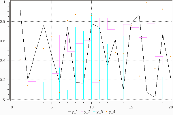 plot(rand(20,4); linetypes=[:line,:step,:sticks,:dots])