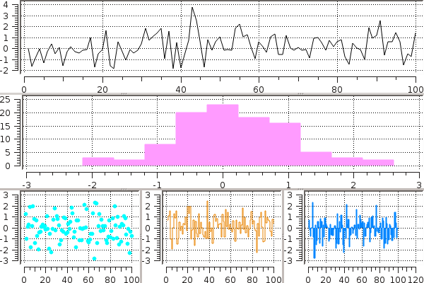 subplot(randn(100,5); layout=[1,1,3],linetypes=[:line,:hist,:scatter,:step,:bar],nbins=10,legend=false)