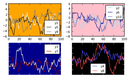 subplot(fakedata(100,10),n=4,palette=[:grays :blues :heat :lightrainbow],bg=[:orange :pink :darkblue :black])