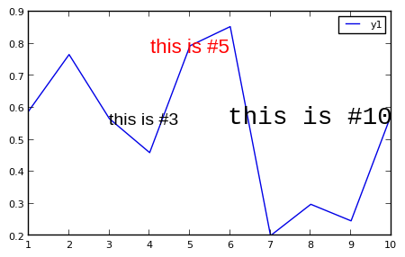 annotate!([(5,y[5],text("this is #5",16,:red,:center)),(10,y[10],text("this is #10",:right,20,"courier"))])